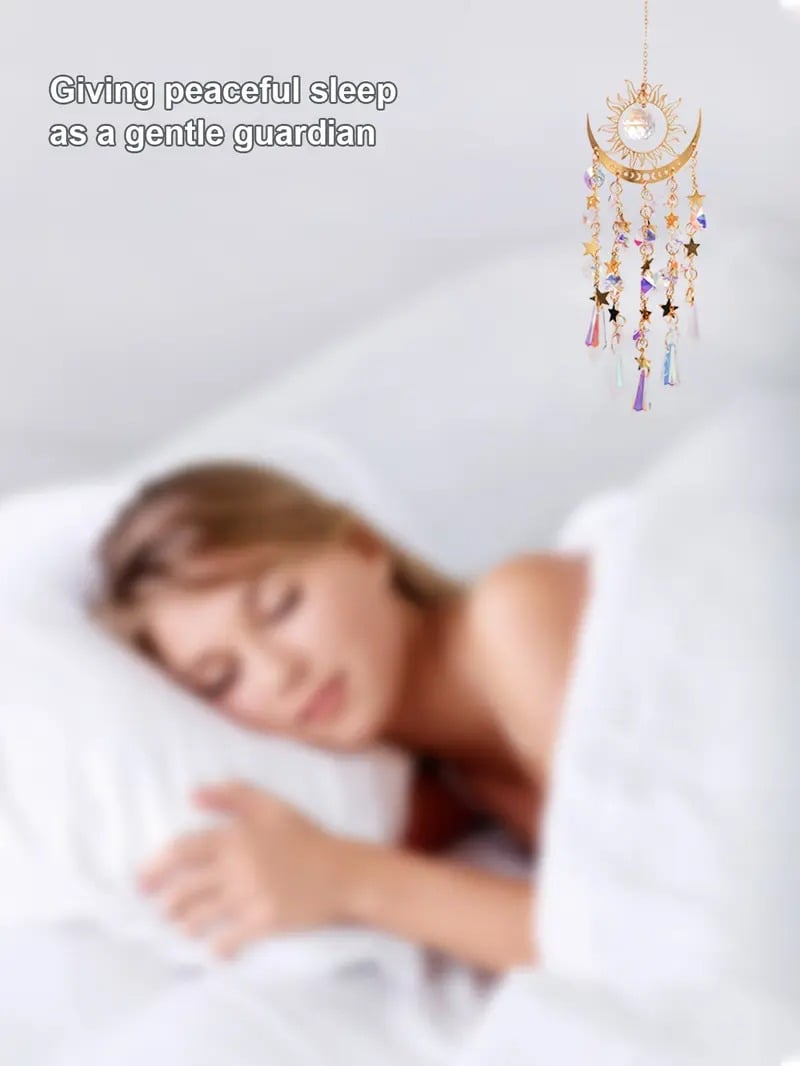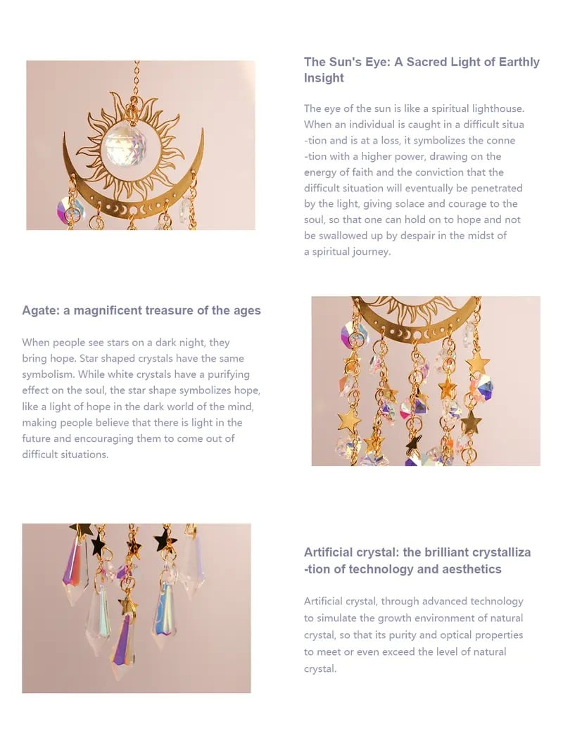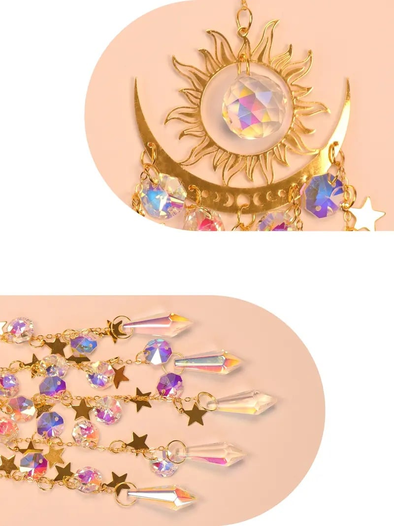 🌈RainbowMaker: Suncatcher has a shiny metal frame with sun, moon and star patterns. Artificial crystals and pendants catch the sunlight and create a dreamy light-shadow effect. The unique design, fine craftsmanship and strong decorativeness make it a captivating work of art.